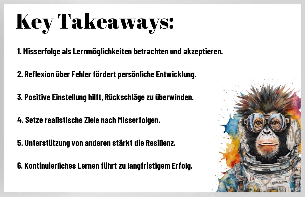 • Misserfolge sind wertvolle Lernmöglichkeiten, die helfen, Schwächen zu identifizieren und zu beheben.